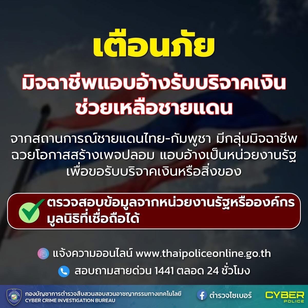Categories ข่าวประชาสัมพันธ์ เตือนภัยมิจฉาชีพแอบอ้างบริจาคเงินช่วยเหลือชายแดน Estimated read time 0 min read 0 comments จำนวนผู้เข้าชม: 41